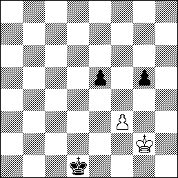 ? ? ? ? ? ? ? ? 1. Kh1! de enige zet! 1. ... Kd2 2. Kh2 Kd3 3. Kh3 Ke2 4. Kg2 Ke3 5. Kg3 Kd4 6. Kg4 Ke3 7. Kg3 remise